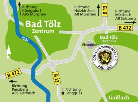 Ausfahrt Holzkirchen. Über die B13 nach Bad Tölz. Ab hier über die B472 ca. 200m nach dem Eisstadion links Richtung Gaissach der Beschilderung Golfplatz folgen.