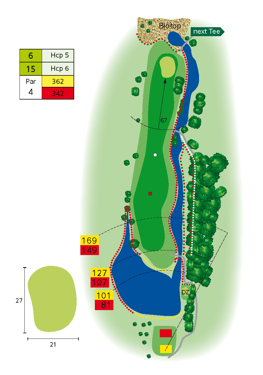 Par 4Bahn 6: HCP 5Bahn 15: HCP 6Gelb: 362 Rot: 342