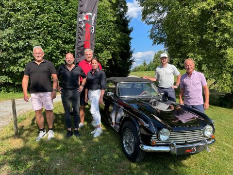 Der Triumph-Oldtimer war die Deko beim Siegerfoto mit (v.li.) Markus Harrer (Gewinner Netto C), Oliver Wick (Veranstalter), Oliver Hüsken (Netto A), Heidi Harrer (Veranstalter), GCI-Präsident Stefan Harrer, Andreas Andrä (Netto B) und Dreifachsieger Eckhardt Teiber. Foto: gci