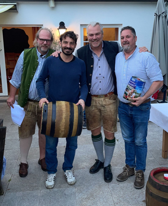 Organisator Mike Hüsken (li.) und Mitveranstalter Oliver Hüsken (2.v.re.) mit Eishockeystürmer Franz Mangold (2.v.li.), der die Sonderwertung „Nearest to the Fassl“ gewann und zu seinem Comeback beim SC Reichersbeuern 35 Liter Bier mitbringen kann. Trainer Thomas Gams (re.) gewann einen Fünf-Liter-Humpen.